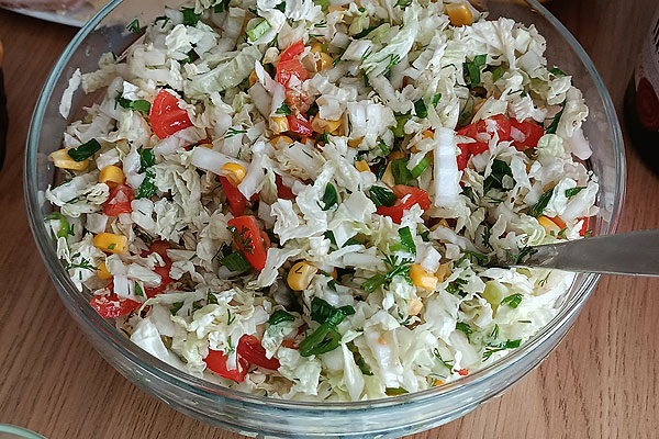 Все овощи выкладываем в большую миску, солим и хорошенько перемешиваем.