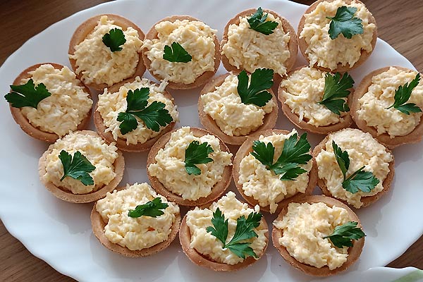 Тарталетки – эти симпатичные печеные корзинки, которые придумали во Франции. Какой же праздничный стол может обойтись без них, ведь они не только очень вкусные, но и настоящее украшение стола, если проявить чуть-чуть фантазии. Сегодня я предлагаю тарталетки, наполненные массой из плавленых сырков, яиц и чеснока. На полках магазинов можно купить уже готовые тарталетки, причем с разного теста – слоеные, песочные, пресные и др. Я же, предпочитаю печь тарталетки сама, используя специальные формочки для выпечки.
