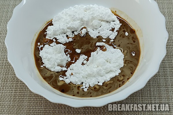 Молоко з кавою додаємо до яєчно-цукрової маси та ретельно перемішуємо.