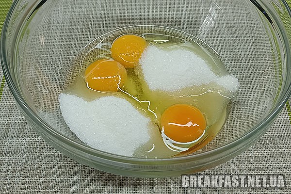 У миску розбиваємо яйця, додаємо цукор, дрібку солі та ванільний цукор.
