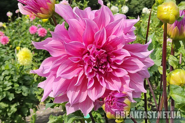 А це для гарного настрою! Серед зеленого мережива листя розкривається розкішна квітка, немов витвір мистецтва, створений самою природою. І це - Георгіна! Її пелюстки - хвилясті, шовковисті, наповнені життям та кольором. Вони розходяться від серцевини у пишному каскаді рожево-фіолетових відтінків, що переливаються під променями сонця, немов дорогоцінне сяйво. У центрі квітки - таємнича глибина, де темніший рожевий плавно переходить у насичені пурпурові тони. Ця гармонія кольорів створює відчуття об’єму й живої енергії, ніби сама квітка дихає, ловлячи світло та повітря. Молоді бутони поряд, як обіцянка продовження краси, тихий шепіт природи про те, що кожна мить розквіту варта очікування. Її вигляд вражає поєднанням ніжності й сили: витончена форма поєднується з рішучістю кольору, а кожна пелюстка здається мазком пензля, продуманим до дрібниць. Така квітка не просто прикрашає сад - вона створює атмосферу радості, гармонії й тепла, перетворюючи звичайний куточок землі на справжню оазу краси.