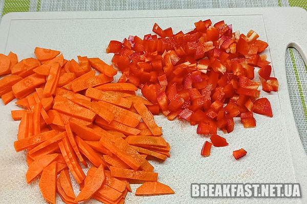 Тим часом соломкою нарізаємо моркву, кубиком нарізаємо болгарський перець.