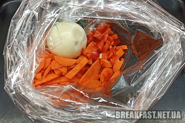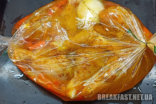 Зверху викладаємо курячі гомілки, додаємо воду чи бульйон та зав'язуємо рукав.