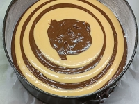 Вливаємо по черзі в центр форми невеликі порції тіста, змінно, біле, чорне, біле, чорне і так до кінця.