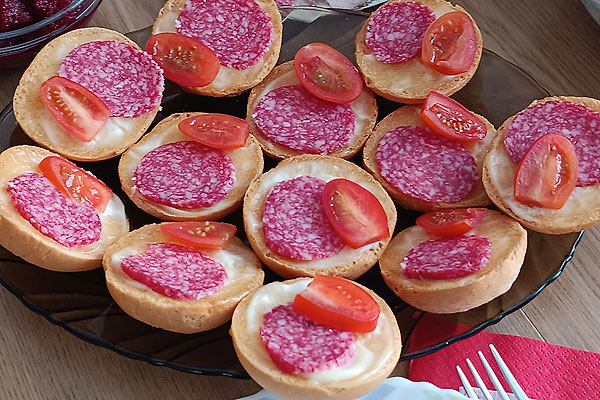 дуже чудова, смачна закуска, яка буда на моєму святковому столі, використовувала круглі пшеничні грінки, шпроти та помідори чері)))СМАКОТА!