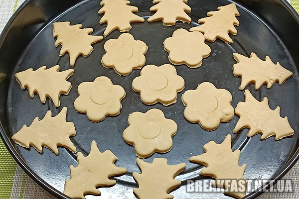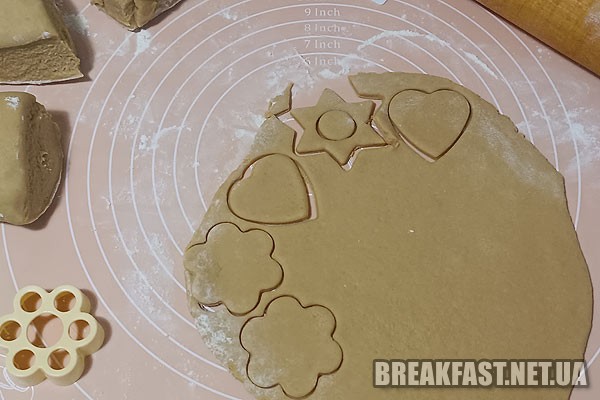 Розкачуємо тісто у пласт (приблизно 5 мм) та вирізаємо печиво за допомогою формочок.
