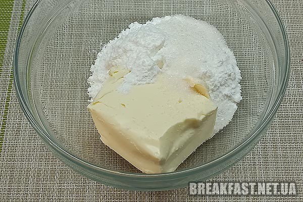 У миску викладаємо м'яке вершкове масло, додаємо цукрову пудру та ванільний цукор.