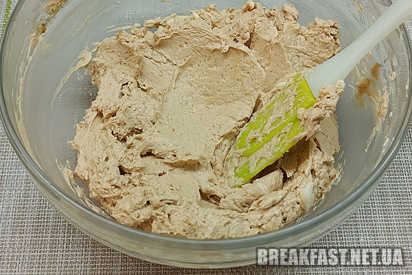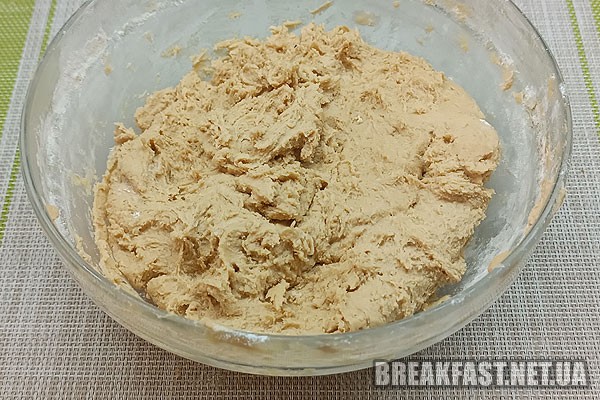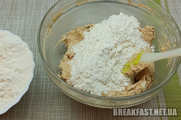 Невеликими порціями вводимо до маси просіяне борошно та замішуємо тісто.