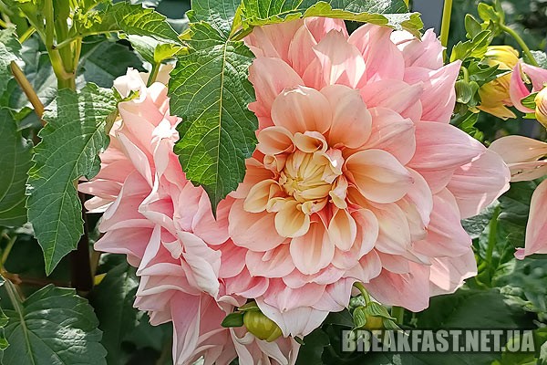 А це для гарного настрою! Погляньте на цю неймовірну Жоржину! Її пишні персикові пелюстки плавно переходять у світло-кремовий центр, немов сонячне світло сяє зсередини. Кожна квітка - це маленький витвір мистецтва природи: багатошарові суцвіття створюють ніжний об’єм та відчуття гармонії. А зелень листя підкреслює свіжість та життєву енергію цієї королеви Львівського ботанічного саду. Вона не просто красива - вона надихає на спокій, творчість та моменти щастя. Доторкніться очима до кожного пелюсткового завитка, відчуйте м’якість кольору та тиху велич природи. Ця Жоржина нагадує, що справжня краса завжди поруч - варто лише помічати її у деталях.