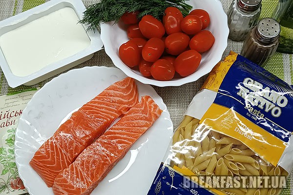 Для приготування Пасти з червоною рибою, сиром Фета та помідорами нам будуть потрібні такі інгредієнти:
