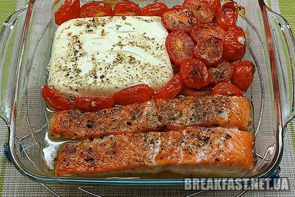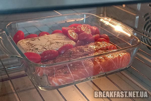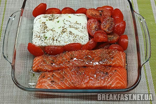 У зручну форму для запікання викладаємо червону рибу, сир Фета та помідори чері, розрізані навпіл.
