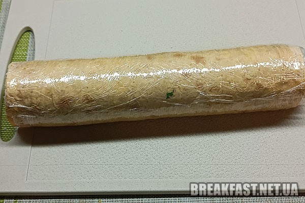 Обгортаємо Рулет з лаваша та консервованим тунцем у харчову плівку та ставимо у холодильник на кілька годин (краще на ніч).