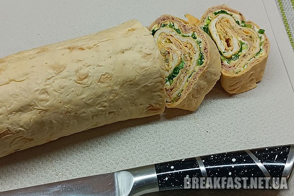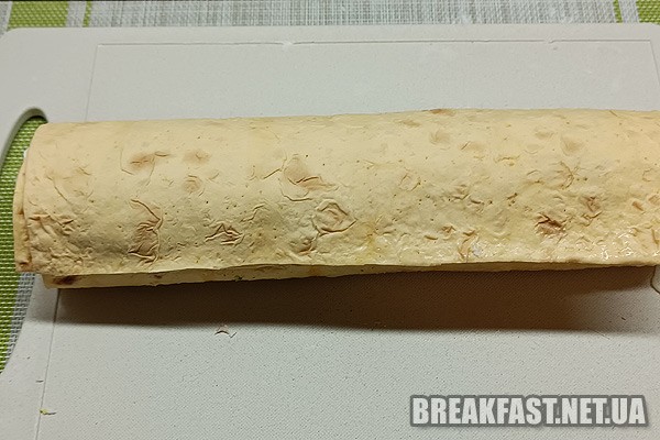 Закручуємо наші лаваші з начинкою у тугий рулет.
