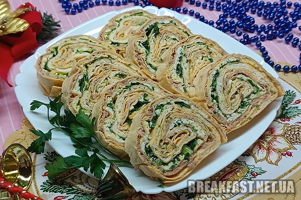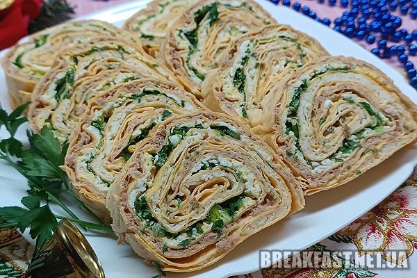 Новорічний стіл - це завжди про атмосферу затишку, святковий настрій та перевірені страви, які хочеться готувати з любов’ю. Коли в домі пахне ялинкою та збираються рідні, особливо важливо мати під рукою прості у приготуванні, але ефектні закуски. Саме до таких належить Рулет з лаваша та консервованим тунцем - легкий, неймовірно ніжний та дуже смачний варіант для святкового меню. Я часто готую саме цей рулет не тільки на Новий рік, але й на інші свята, оскільки він не потребує багато часу, виглядає дуже апетитно на тарілці й чудово поєднується з іншими новорічними стравами. Поєднання консервованого тунця, сиру, яєць, солоних огірків та свіжої зелені створює гармонійний смак, а тонкий лаваш (у мене зі смаком сиру) робить закуску ніжною та соковитою. Цей рулет завжди зникає зі столу одним із перших та щоразу викликає щирі компліменти від гостей. Тож із задоволенням ділюся з вами своїм перевіреним новорічним рецептом.