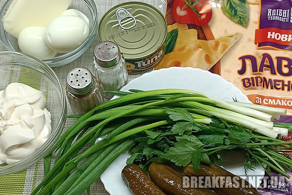 Для приготування Рулету з лаваша та консервованим тунцем нам будуть потрібні такі інгредієнти: