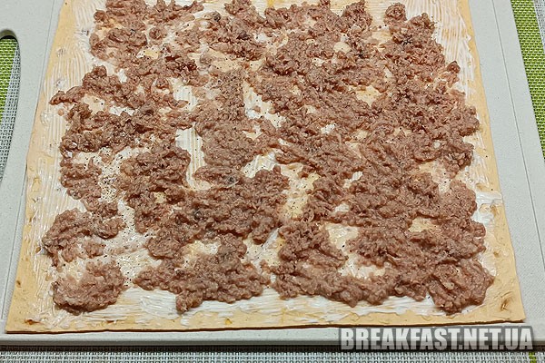 З тунця зливаємо сік, розминаємо його виделкою та розподіляємо рівномірним шаром по всьому лавашу.