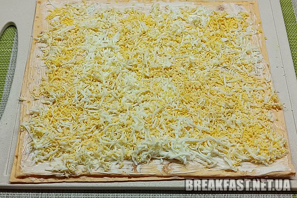Яйця натираємо на дрібній терці та рівномірним шаром викладаємо на лаваш.