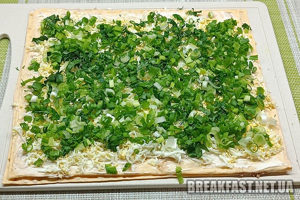 Зелену цибулю, кріп та петрушку (кількість беремо до смаку) дрібно нарізаємо та викладаємо на яйця рівномірним шаром.