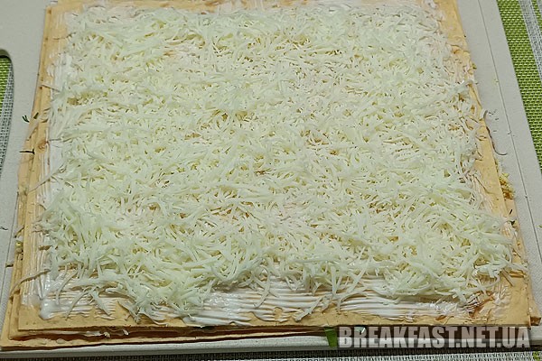 На дрібній терці натираємо сир та викладаємо на лаваш.