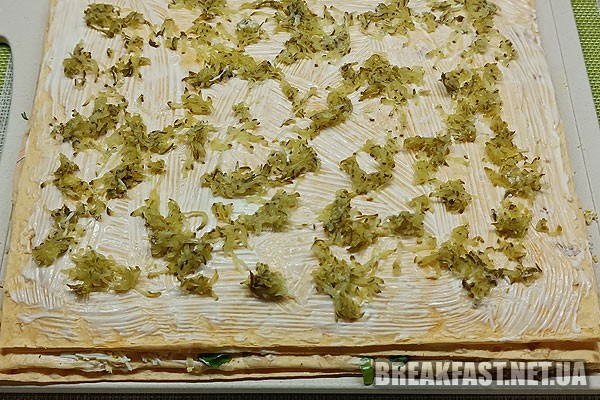 Змащуємо його майонезом та викладаємо солений огірок, натертий на дрібній терці.