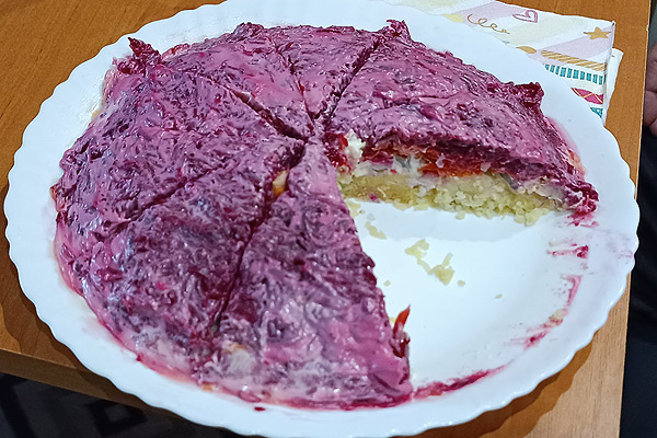 І, нарешті, останній шар — натертий буряк, який також змащуємо майонезом.