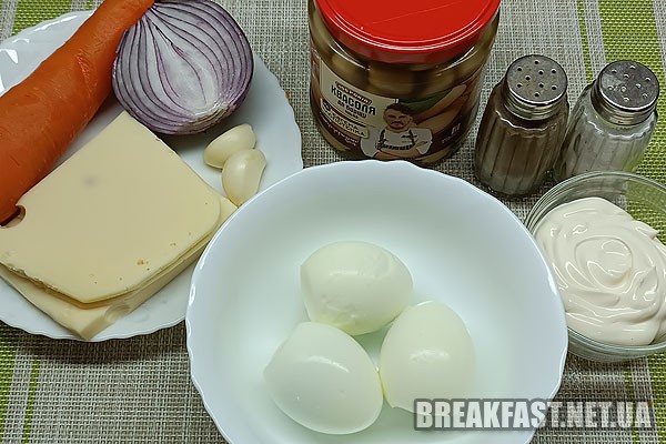 Для приготування Салату з консервованою квасолею нам будуть потрібні такі інгредієнти: