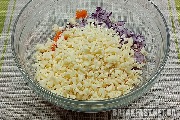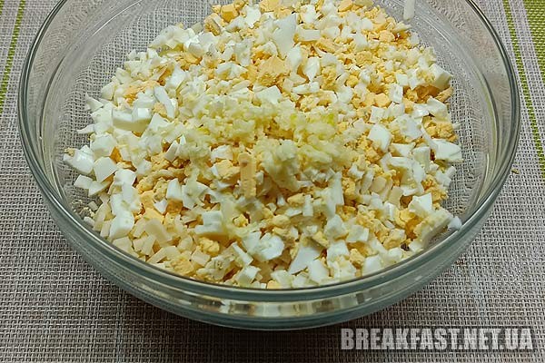 Яйця нарізаємо дрібним кубиком та додаємо до наших продуктів.