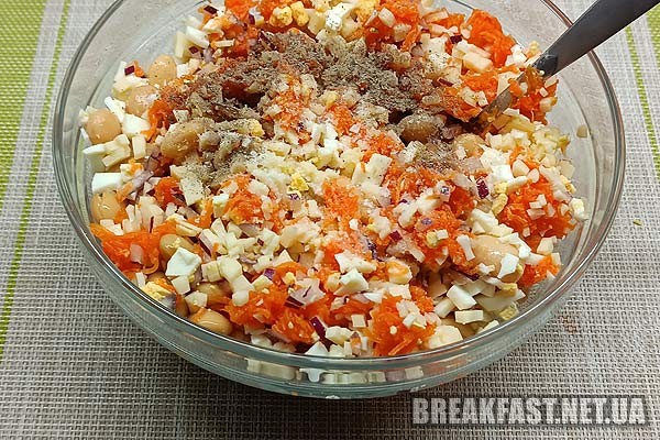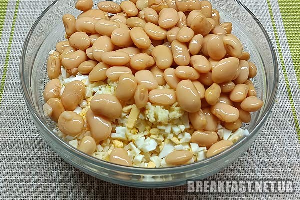 З квасолі зливаємо рідину та додаємо до всіх продуктів.
