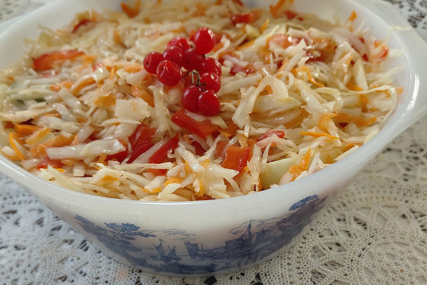 Перекладаємо салат у салатник та прикрашаємо ягідками порічки.