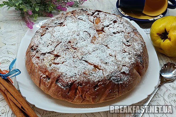 Випікаємо Шарлотку з айвою у розігрітій духовці при 180°C приблизно 35–40 хвилин, до золотавої скоринки.