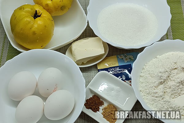 Ось такі продукти нам будуть потрібні для приготування дуже смачної Шарлотки з айвою.