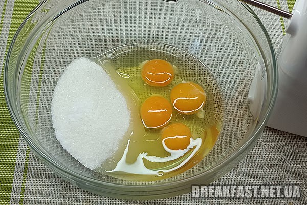В миску розбиваємо яйця, додаємо цукор, ванільний цукор та щіпку солі.