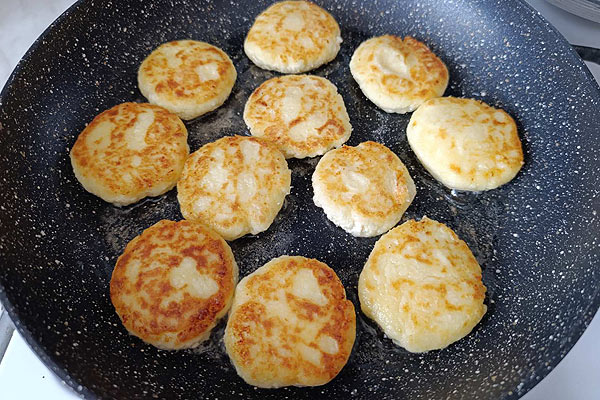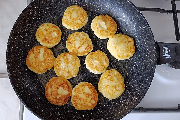Обсмажуємо сирники із родзинками з обох боків до золотистої скоринки.