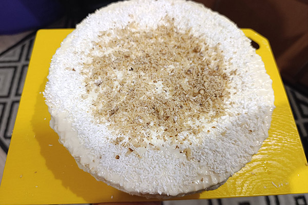 Верх торта та боки також змащуємо невеликим шаром крему, посипаємо горіхами, які я заздалегідь підсмажила та подрібнила та кокосовою стружкою.