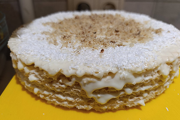 Вікуся, запевняю тебе, що схожий, бо в ньому є кокосова стружка. Тортик виходить дуже оригінальний за смаком, бо ми ж звикли що вафлі мають бути перемащені згущеним молоком. Рекомендую не давати багато крему на кожну вафлю, бо так він скоріше розмокне... але і в такому стані він дуже смачний, бо тяжко здогадатися, що він приготований саме з вафлів.