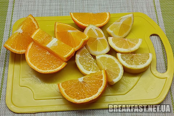 Лимон та апельсин разом зі шкіркою нарізаємо часточками (кісточки виймаємо).