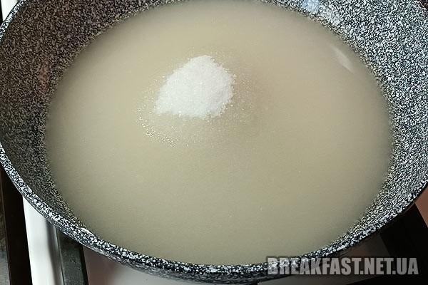 До глибокого посуду з товстим дном наливаємо склянку води та додаємо цукор.