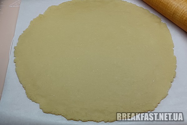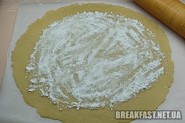Розкачуємо тісто у круглий, тонкий пласт (приблизно 2 мм).