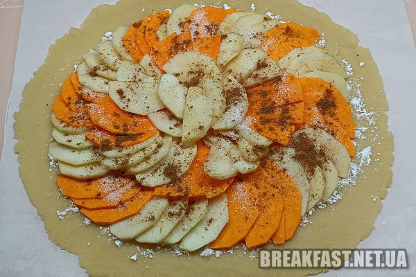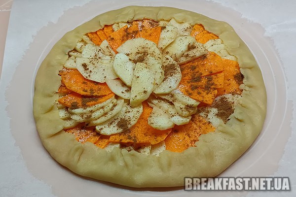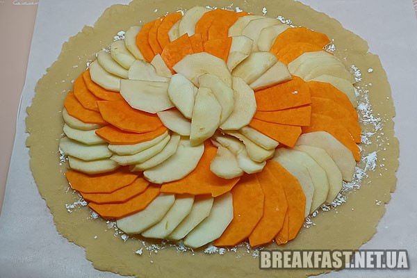 На крохмаль по колу викладаємо порізані яблука та гарбуз.