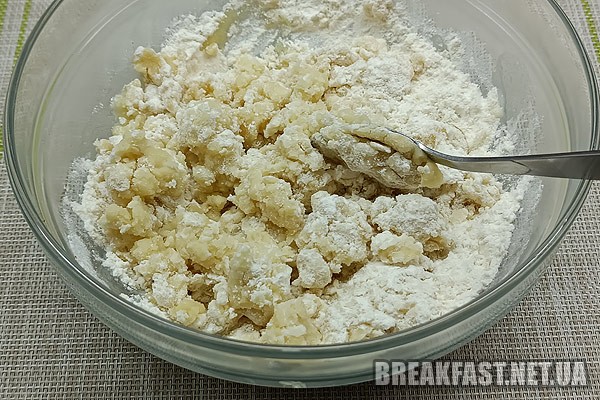 Воду з олією додаємо до борошна та швидко замішуємо тісто.