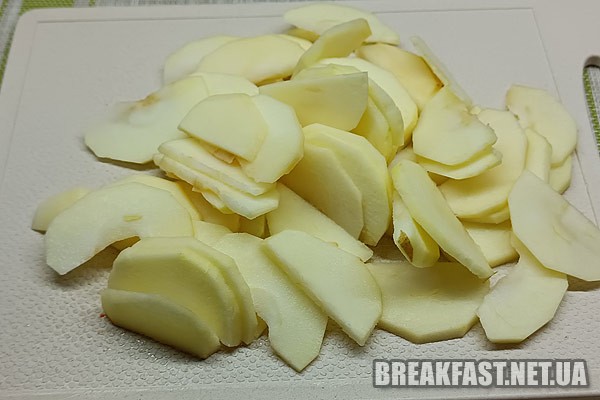 Яблука чистимо, розрізаємо на 4 частини, вирізаємо серединку та нарізаємо тонкими дольками.