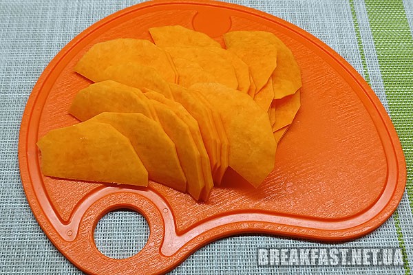Так само дольками нарізаємо гарбуз, намагаємося нарізати їх якомога тонше.