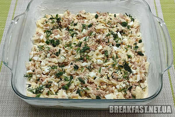 Відставляємо поки що тісто для Заливного пирога з тунцем в сторону та приготуємо начинку.