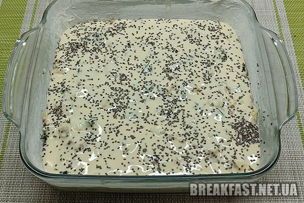 Рівномірно виливаємо решту тіста, щоб воно покрило всю начинку.