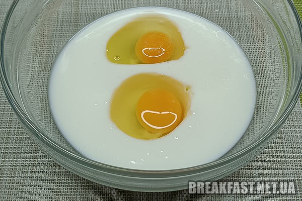 В миску виливаємо кефір, додаємо дрібку солі та яйця.