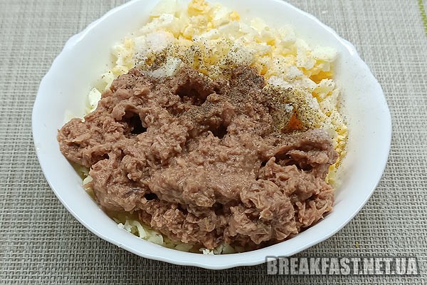 Додаємо консервований тунець, сіль, чорний перець до смаку.